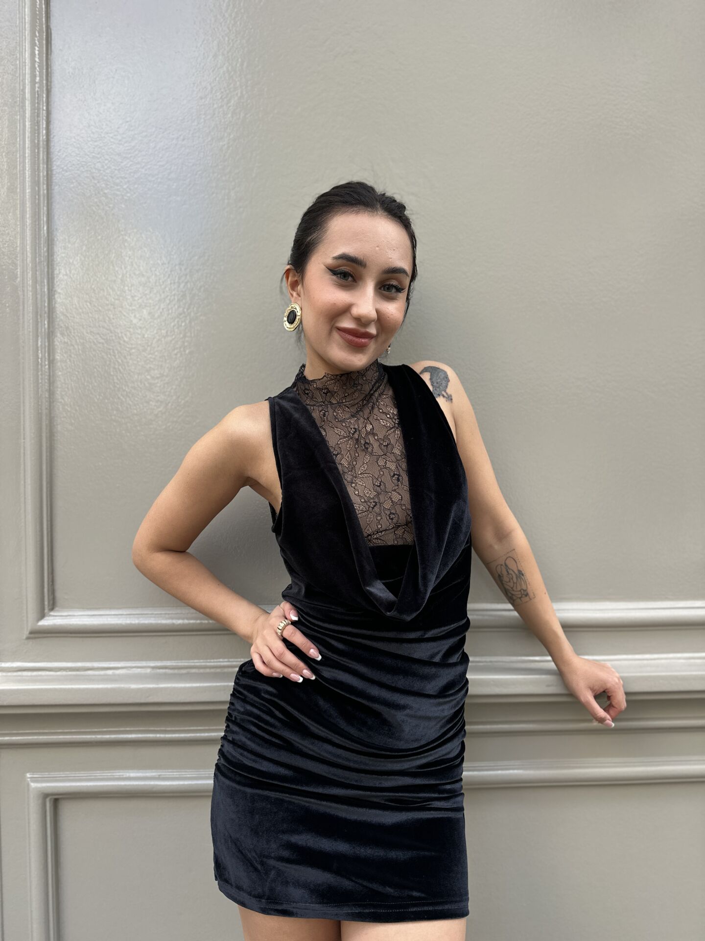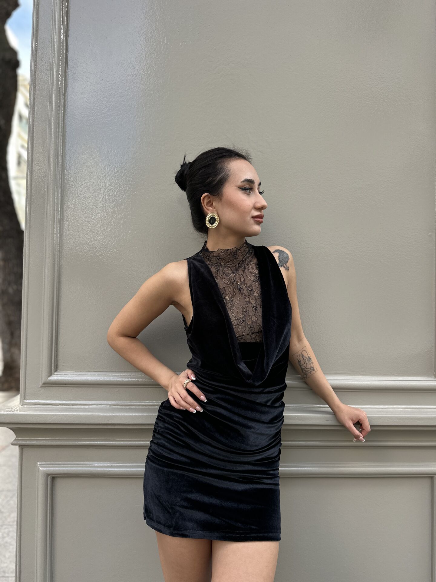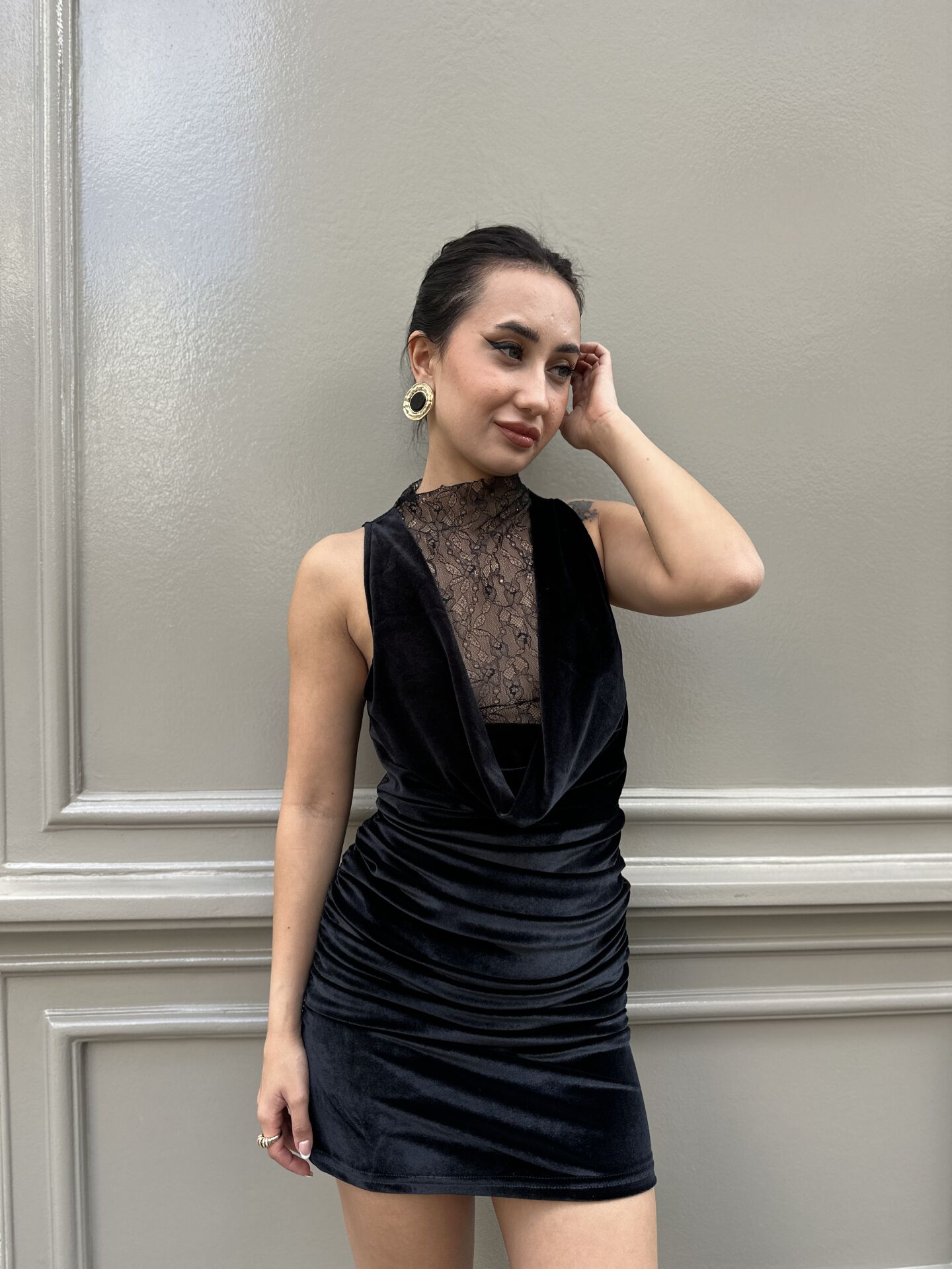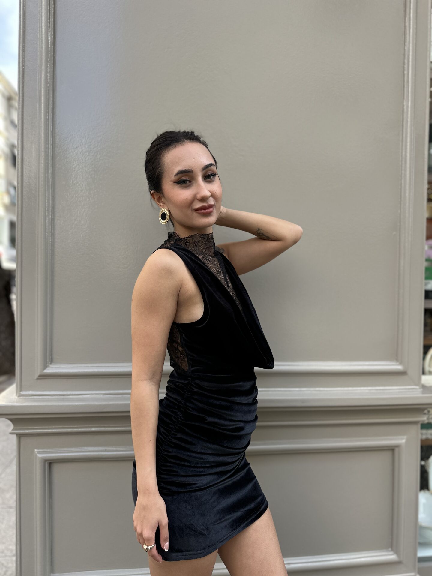 Dantel Detayli Mini Kadife Davet Elbisesi