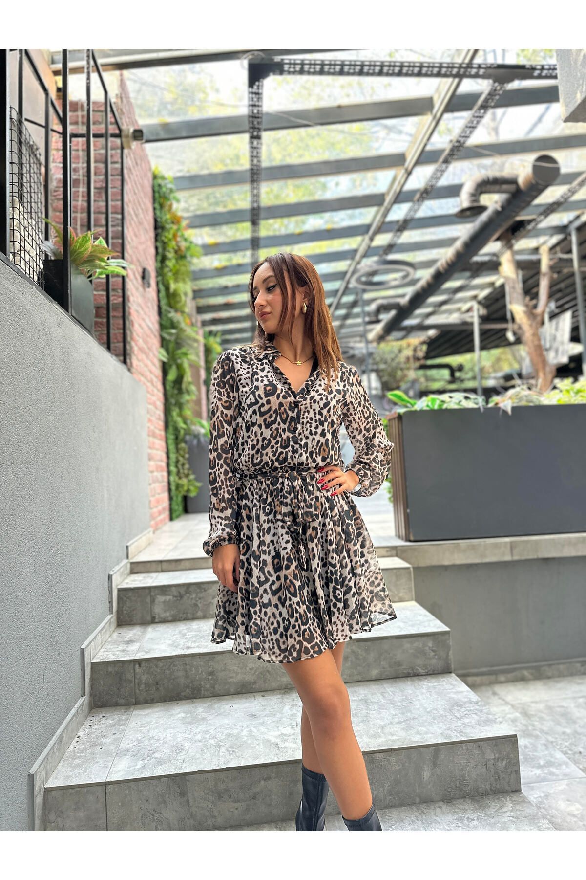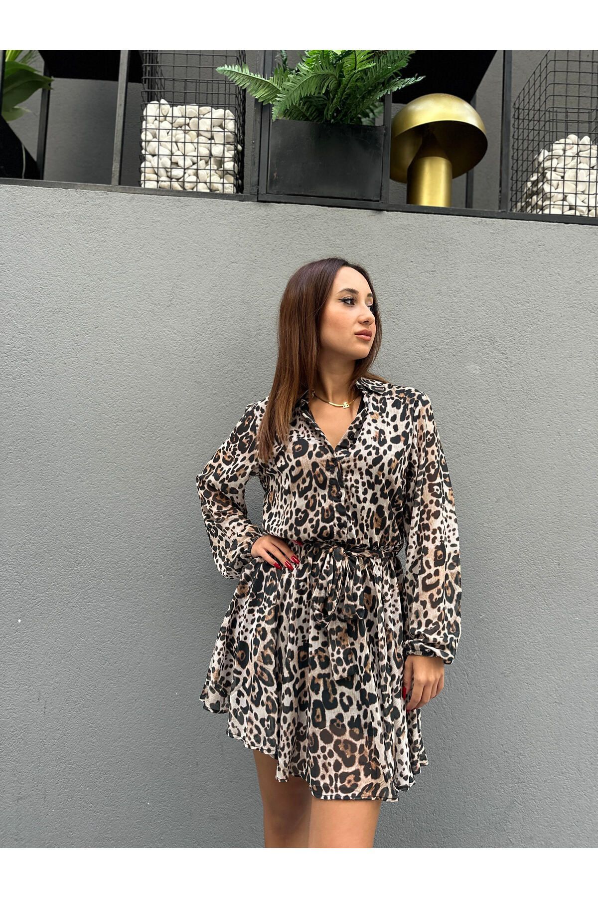 Şifon Astarlı Mini Elbise Leopar - S